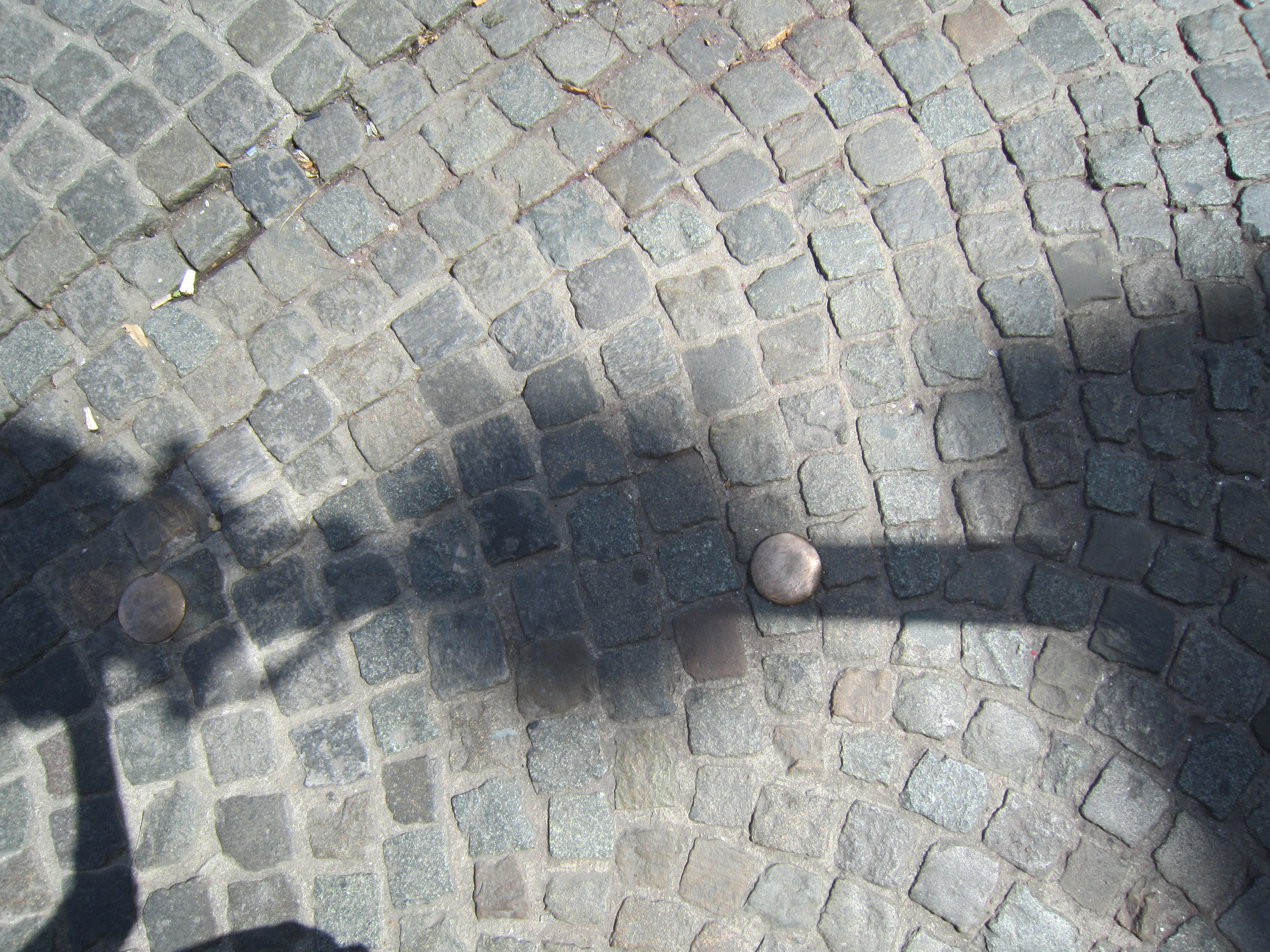 De passage van de meridiaanlijn op 5 augustus 2016. Quetelet zou wellicht gefronst hebben over de beslissing van het Brugse stadsbestuur om een lantaarnpaal nabij het tracé te plaatsen. Bron: Fotografie L. Diser.